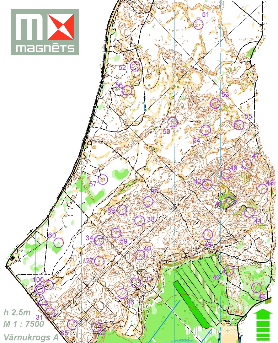 Marķējums no Babītes (pagrieziens uz Vārnukrogu). Apvidus: detalizēts kāpu reljefs dažādu audžu priežu mežā. Magnēta bērnu skoliņa 13:00.