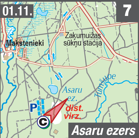 Marķējums no Mālpils šosejas. Apvidus: neliels kāpu reljefs, parkveida priežu mežs, priežu jaunaudzes un regulārs stigu tīkls. Magnēta bērnu skoliņa 13:00